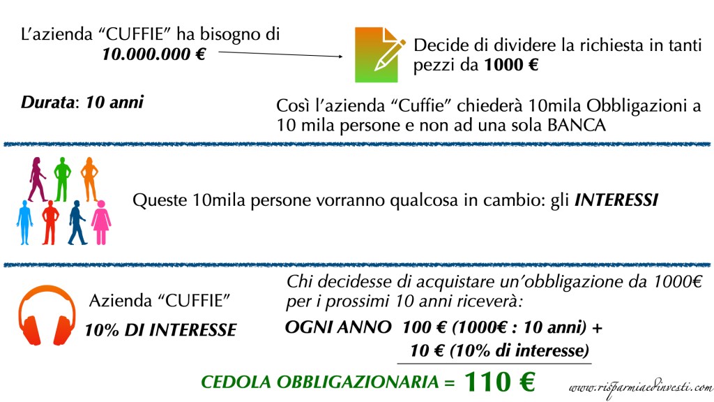 L’azienda “CUFFIE” sceglie di emettere obbligazioni e ora ha bisogno di 10 milioni di € e una durata di 10 anni e decide di dividere questa richiesta in tanti pezzi da 1000€.