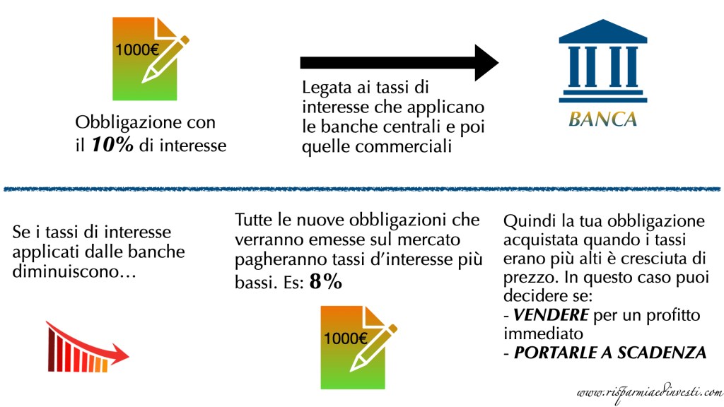 Abbiamo acquistato obbligazioni dall’azienda “CUFFIE” che ricordiamo pagano un 10% d’interesse, che applicano prima le banche centrali e poi quelle commerciali. Se però questi interessi diminuiscono, le nuove obbligazioni che verranno emesse sul mercato pagheranno tassi di interesse più bassi (8%), quindi l’obbligazione che hai acquistato con l’interesse al 10% è cresciuta di prezzo.