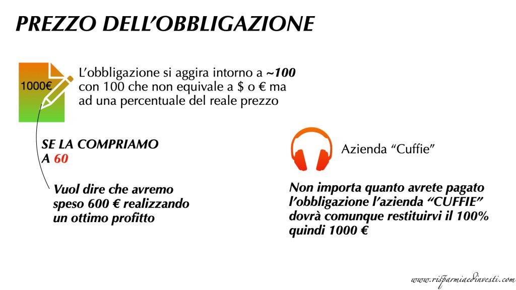 Per esempio se la nostra obbligazione costa 1000 € e noi la compriamo a 60, vuol dire che l’obbligazione l’abbiamo pagata 600€